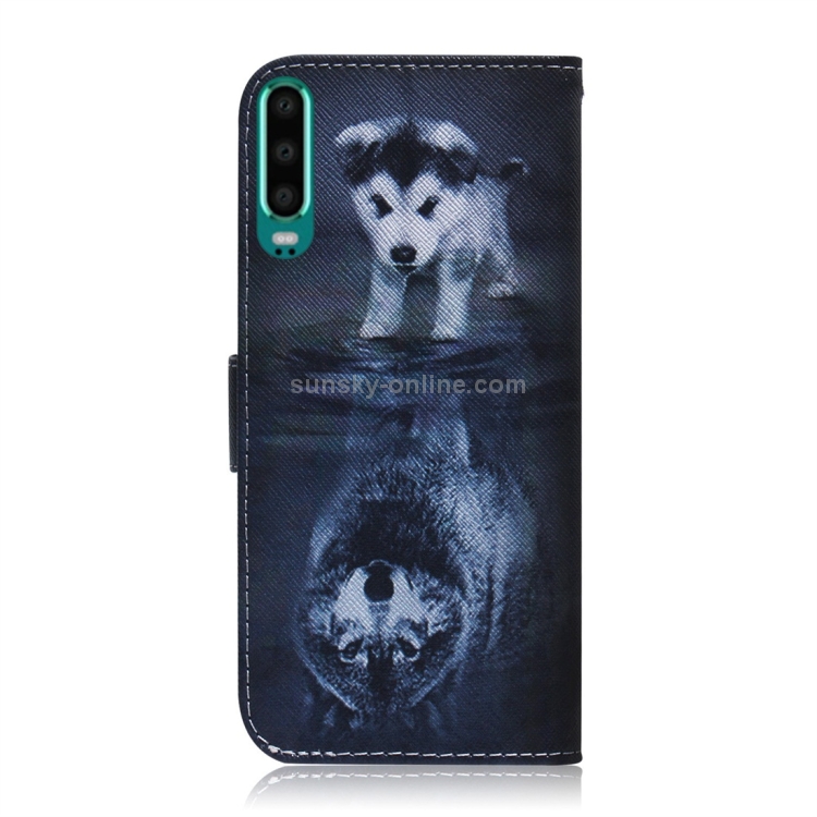 Funda de Cuero con Tapa Horizontal para Huawei P30 con Soporte, Ranuras y Billetera (Lobo y Perro)