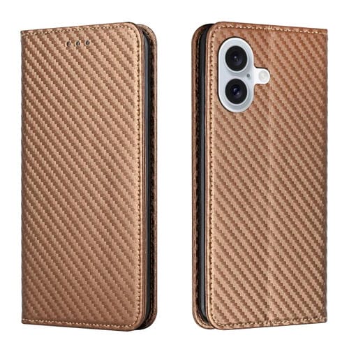 Funda de Cuero con Tapa Magnética y Textura de Fibra de Carbono para iPhone 16 Plus (Marrón)