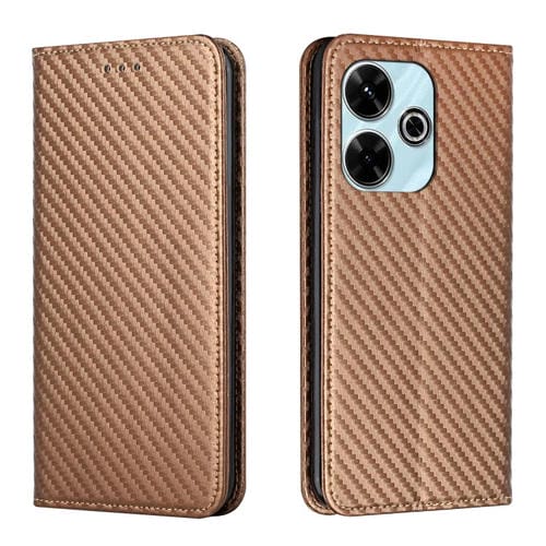 Funda de Cuero con Tapa Magnética y Textura de Fibra de Carbono para Xiaomi Redmi 13 4G (Marrón)