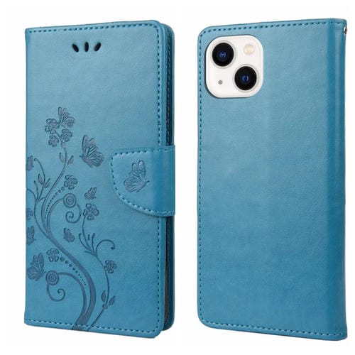Funda de Cuero con Tapa para iPhone 14 Estampado Flores Mariposa (Azul)