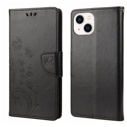Funda de Cuero con Tapa para iPhone 14 Estampado de Flores de Mariposa (Negro)