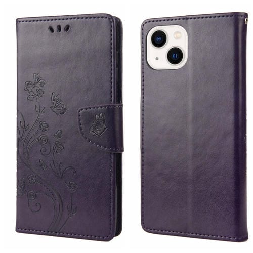 Funda de Cuero con Tapa para iPhone 14 Estampado Flores Mariposa (Púrpura Oscuro)