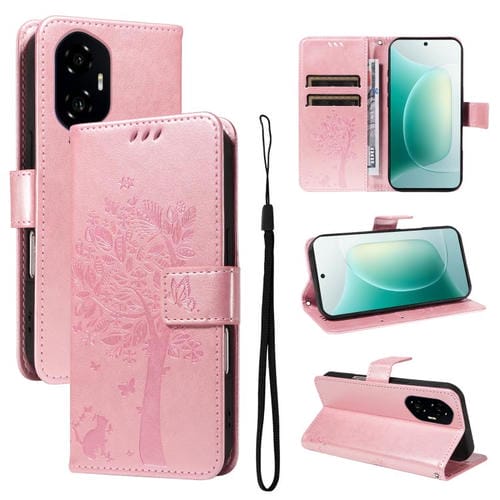 Funda de Cuero con Tapa para Honor 300 con Diseño de Árbol y Gato en Relieve (Oro Rosa)