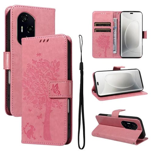Funda de Cuero con Tapa para Honor 300 Pro/300 Ultra con Diseño Árbol y Gato (Rosa)