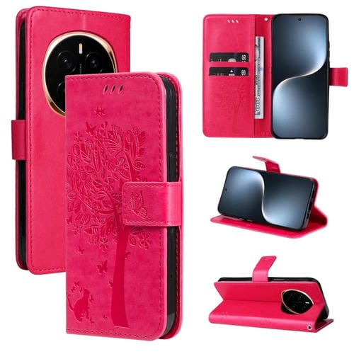 Funda de Cuero con Tapa para Honor Magic7 con Estampado de Árbol y Gato (Rosa Rojo)