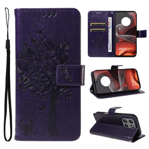 Funda de Cuero con Tapa para Motorola Moto G15 Diseño Árbol y Gato (Morado)