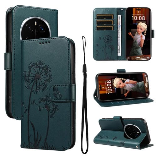 Funda de Cuero con Tapa y Estampado Diente de León en Relieve para Honor Magic7 Pro (Azul)