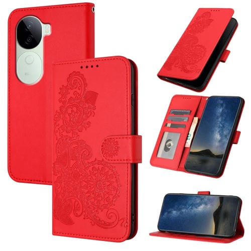 Funda de Cuero con Tapa para Teléfono con Diseño de Flor de Datura En Relieve de la India para Vivo Iqoo Z9S/V40E (Rojo)