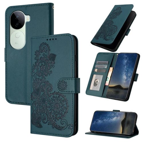 Funda de Cuero con Tapa para Teléfono con Diseño de Flor de Datura En Relieve de la India para Vivo Iqoo Z9S/V40E (Verde Oscuro)