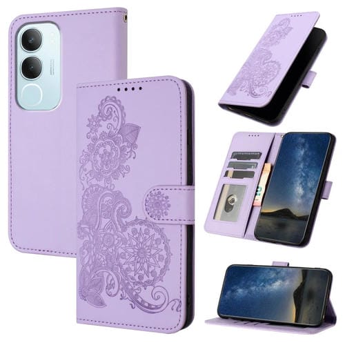 Funda de Cuero con Tapa para Teléfono con Relieve de Flor de Datura para Vivo Y19S Global (Morado)