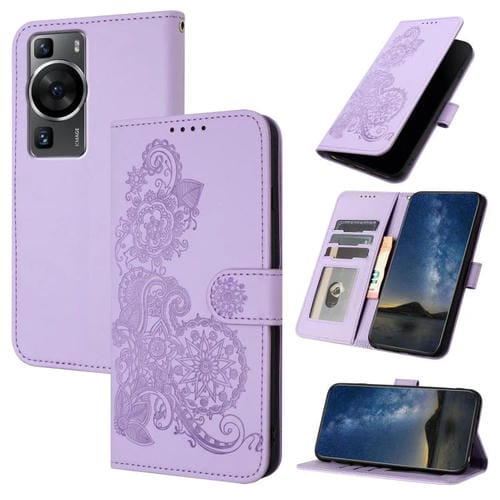 Funda de Cuero con Tapa para Huawei P60/P60 Pro con Relieve Flor de Datura (Morado)