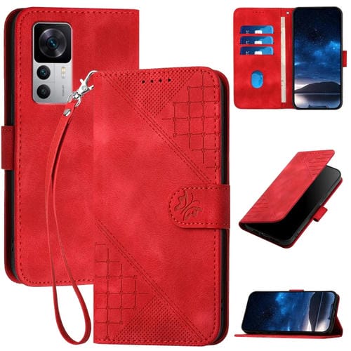Funda de Cuero con Tapa y Cordón para Redmi K50 Ultra Yx0080 con Diseño En Relieve de Mariposa y Cuadrícula (Rojo)