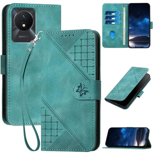 Funda de Cuero con Tapa y Cordón para Vivo Y02A 4G / Y02 4G Yx0080 con Diseño En Relieve de Mariposa y Cuadrícula (Azul Claro)