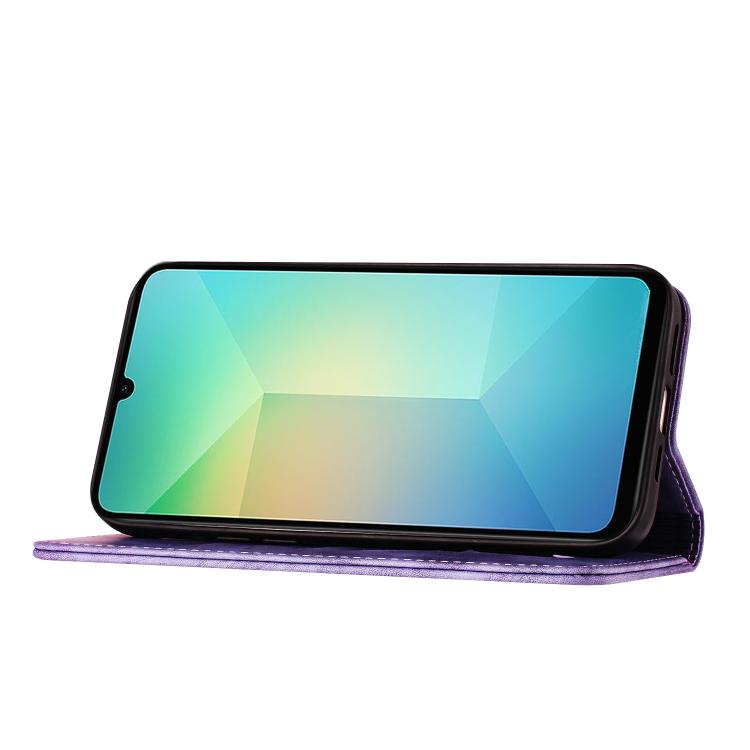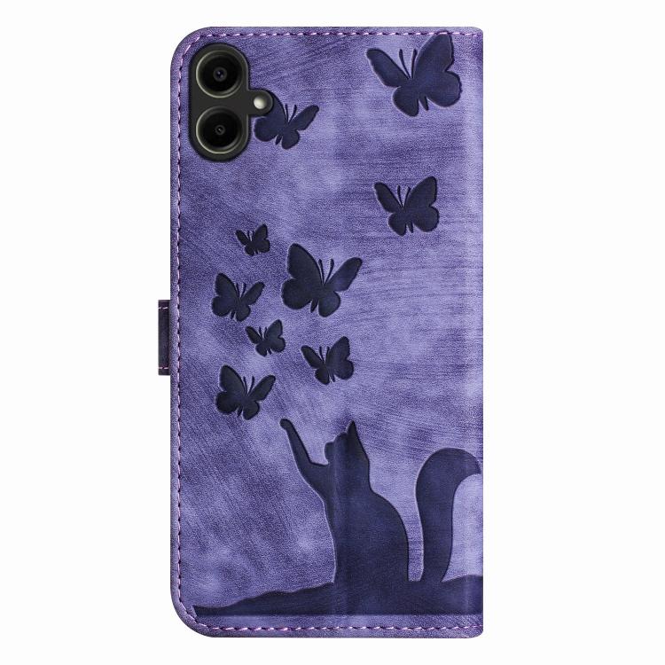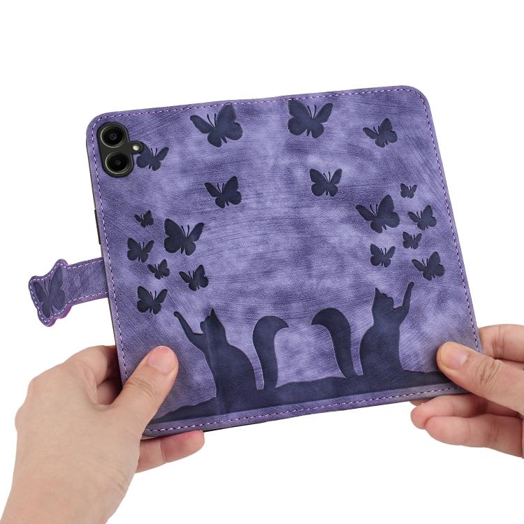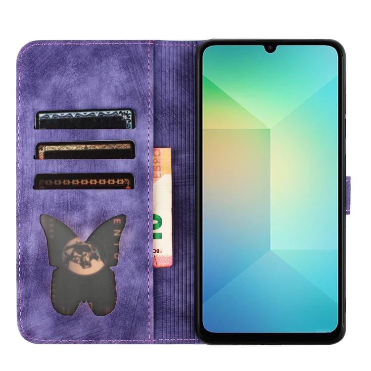 Funda de cuero con tapa y estampado de mariposa y gato para Samsung Galaxy A07 4G / A06 4G (morado)