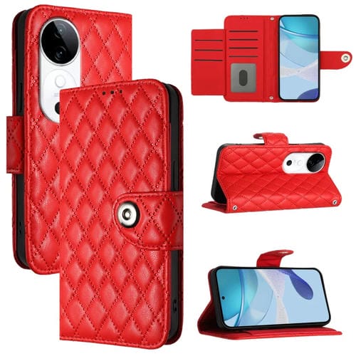 Funda de Cuero con Tapa y Textura Rombal para Teléfono Vivo S19 con Cordón (Rojo)