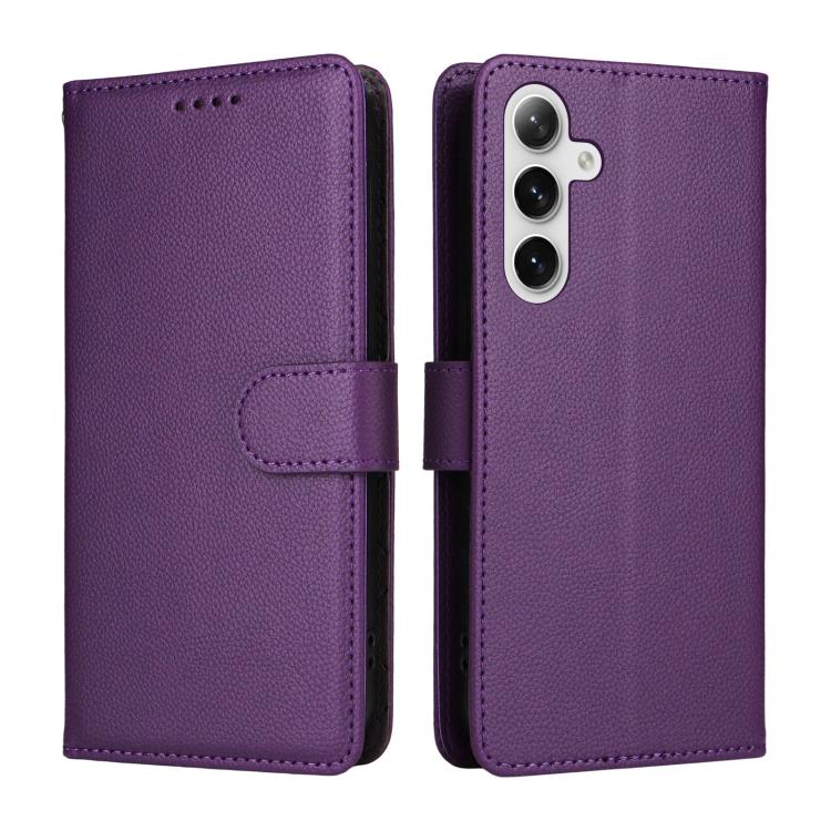 Funda de cuero con textura Litchi para Samsung Galaxy S25/S24 5G, con bloqueo RFID y capacidad para 3 tarjetas (morado)