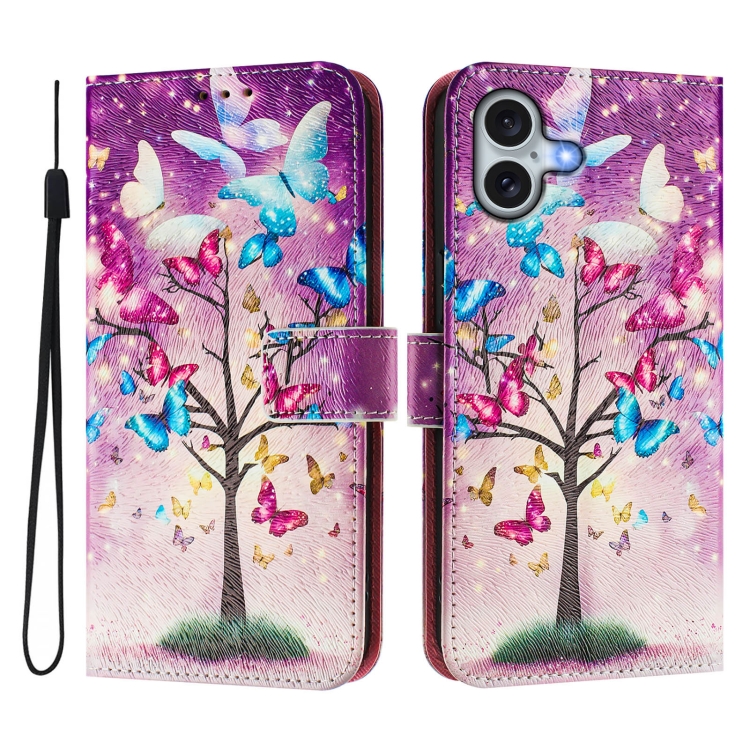 Funda de Cuero para iPhone 16 Patrón Dibujo Artístico Rama de Mariposa (Color)