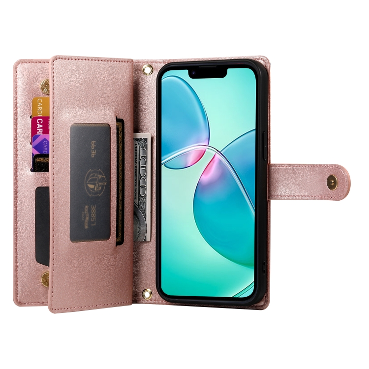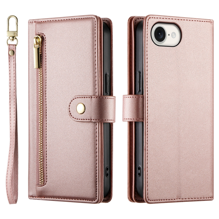 Funda de Cuero para iPhone Se 4 2024 con Nueve Ranuras para Tarjetas y Cremallera (Rosa)