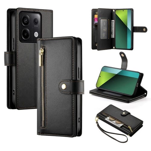 Funda de Cuero para Teléfono con Nueve Ranuras para Tarjetas y Cremallera para Redmi Note 13 Pro 5G/Xiaomi Poco X6 (Negro)
