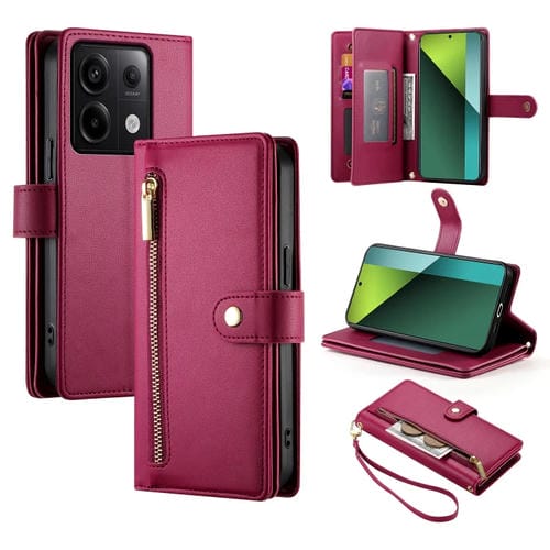 Funda de Cuero para Teléfono con Nueve Ranuras para Tarjetas y Cremallera para Redmi Note 13 Pro 5G/Xiaomi Poco X6 (Rojo)