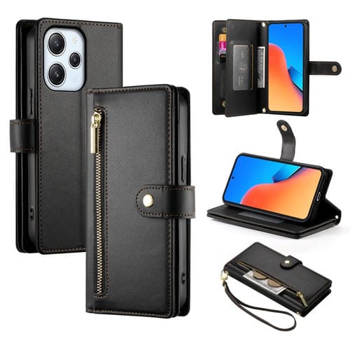 Funda de Cuero para Teléfono Redmi 12 5G/4G/Note 12R con Nueve Ranuras para Tarjetas y Cremallera (Negra)