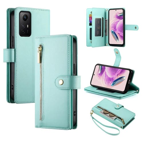 Funda de Cuero para Teléfono Redmi Note 11S 4G con Nueve Ranuras para Tarjetas y Cremallera (Verde Menta)
