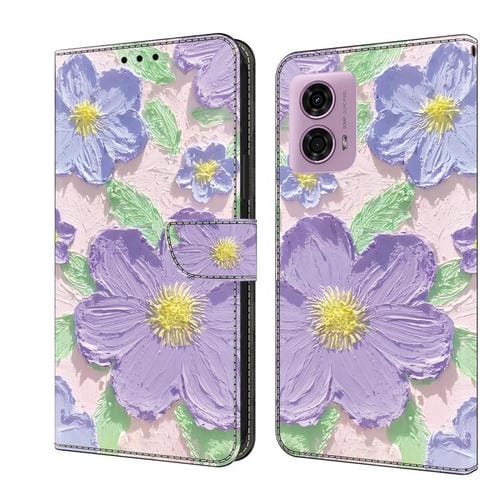 Funda de Cuero Pintada al Óleo para Motorola Moto G24 (Flores Moradas)