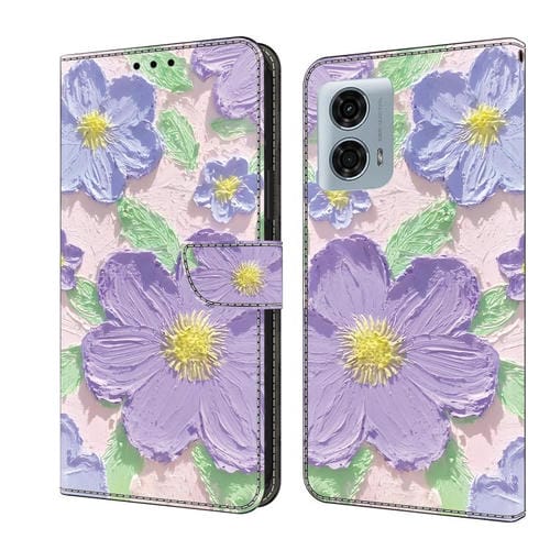 Funda de Cuero Pintada al Óleo para Motorola Moto G24 Power (Flores Moradas)