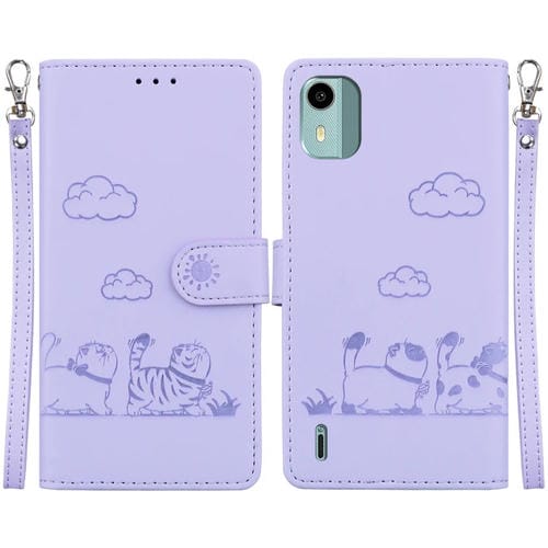 Funda de Cuero Rfid para Nokia C12 con Diseño de Gatos (Morado)