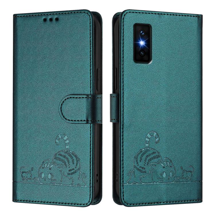 Funda de cuero RFID con estampado de gato y rata para Infinix GT 30 Pro con cordón (verde pavo real)