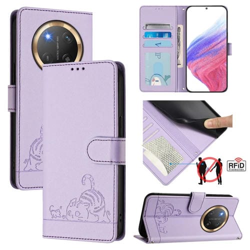 Funda de Cuero Rfid Honor X9C 5G Global con Estampado de Rata y Gato en Relieve y Cordón (Morado)