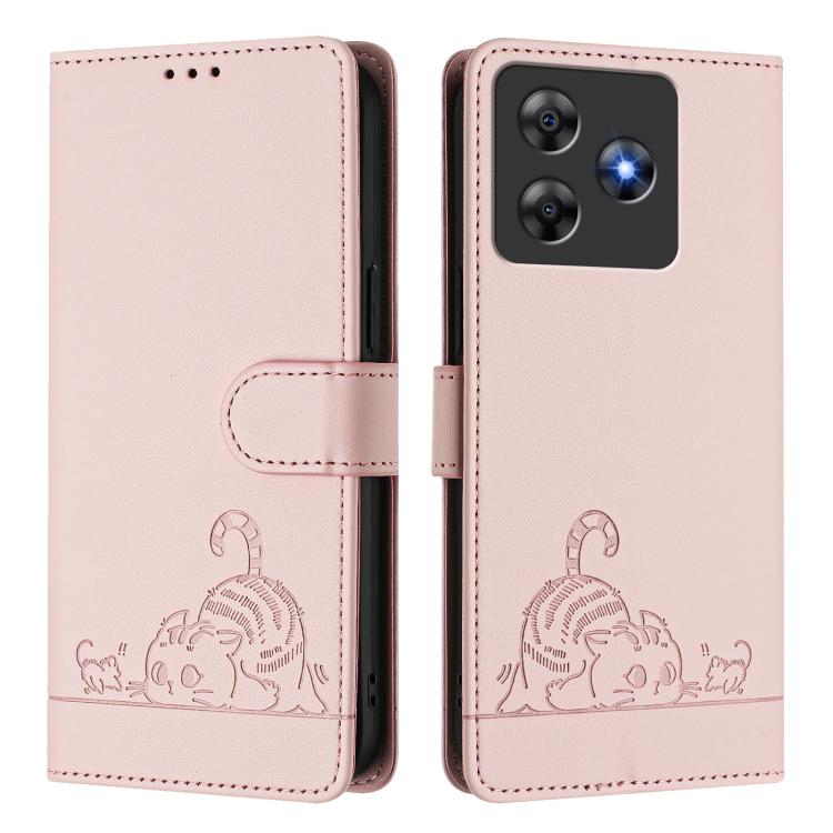 Funda de Cuero Rfid para BlackView Wave 8C con Estampado de Rata y Gato y Cordón (Rosa)