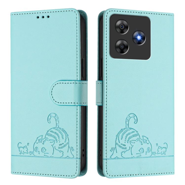 Funda de Cuero Rfid para BlackView Wave 8C con Estampado de Rata y Gato y Cordón (Verde Menta)