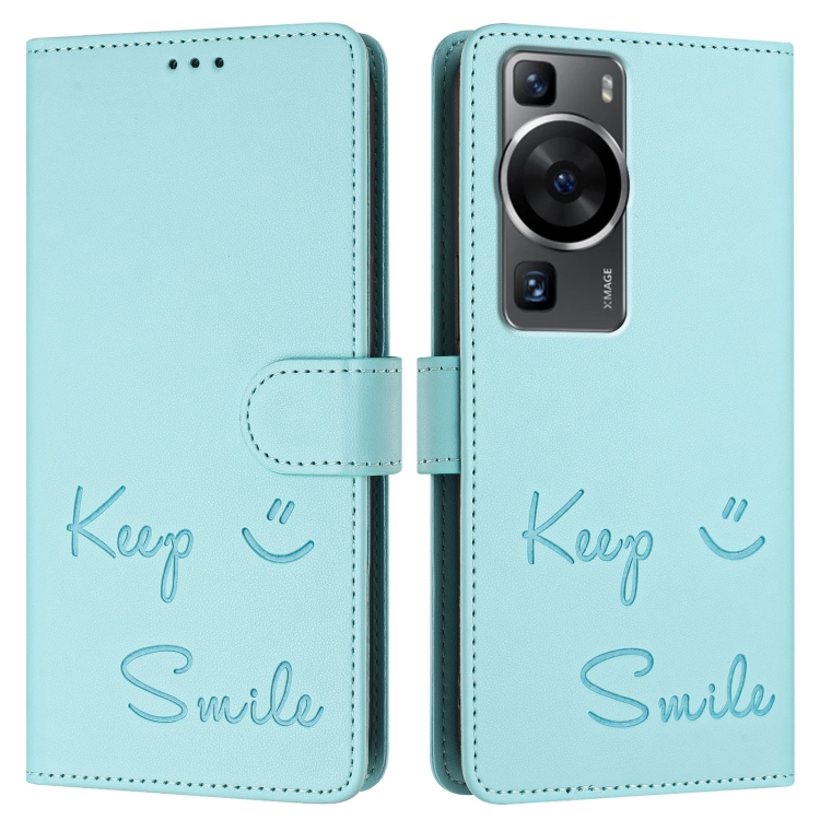 Funda de Cuero Rfid con Relieve Sonriente para Huawei P60/P60 Pro (Verde Menta)