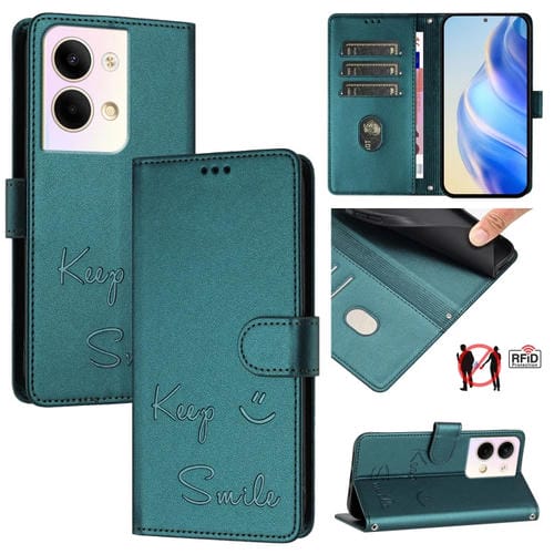 Funda de Cuero Rfid con Relieve Sonriente para Oppo Reno 9 5G/Reno 9 Pro 5G (Verde Pavo Real)