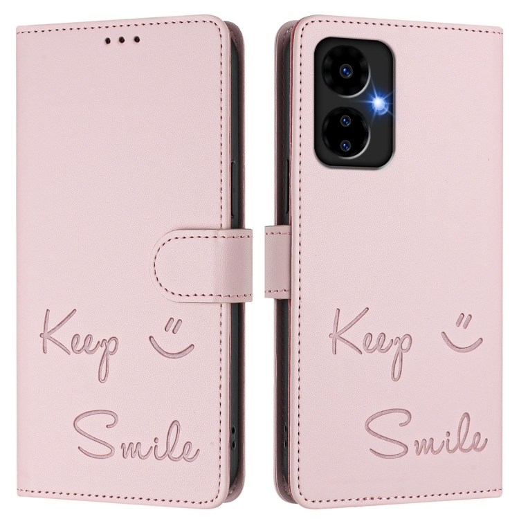 Funda de Cuero Rfid con Relieve Sonriente para Teléfono Boost Mobile Celero 5G (2024) (Rosa)