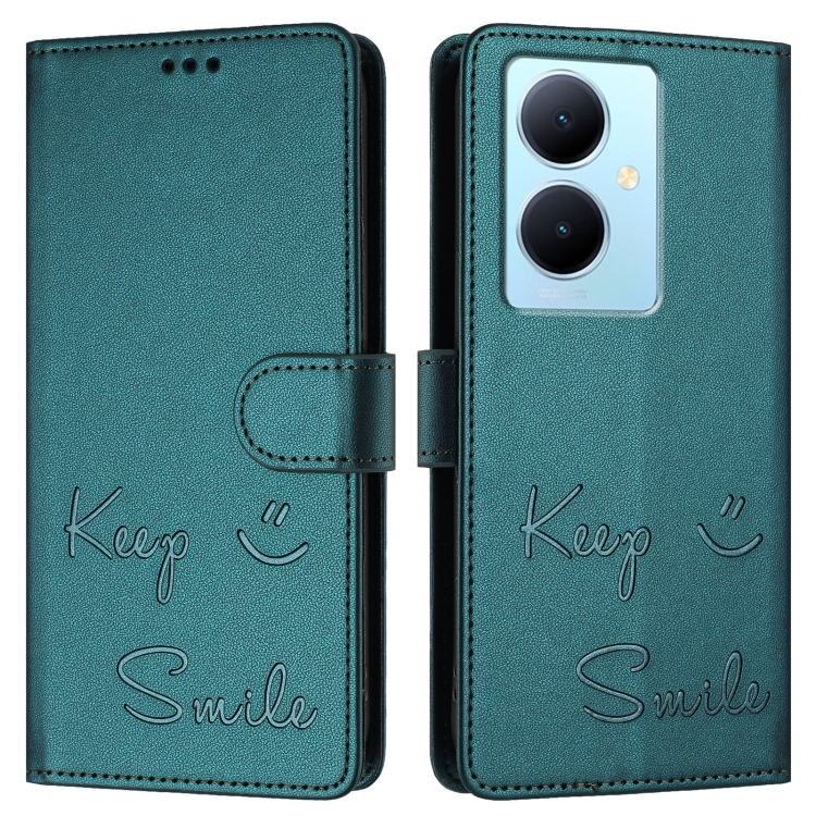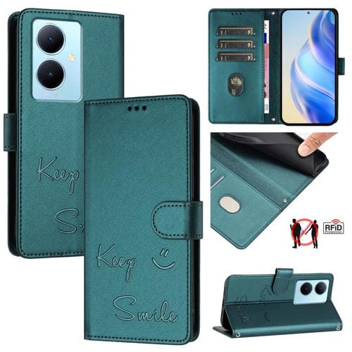 Funda de Cuero Rfid con Relieve Sonriente para Vivo Y78 5G Global / V29 Lite (Verde Pavo Real)