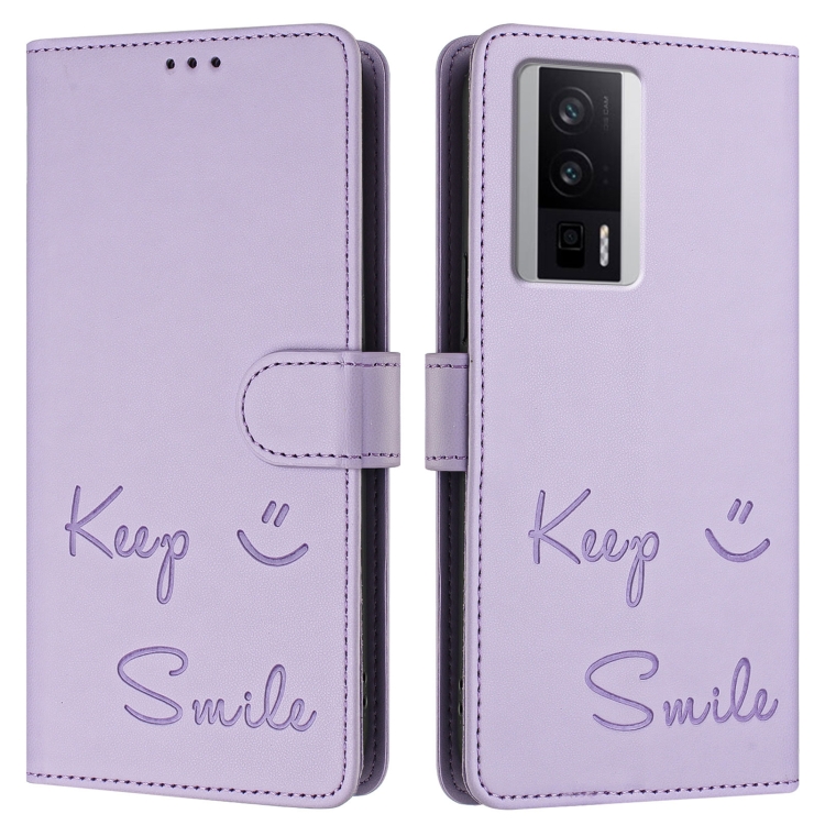 Funda de Cuero Rfid con Relieve Sonriente para Xiaomi Poco F5 Pro (Morado Claro)