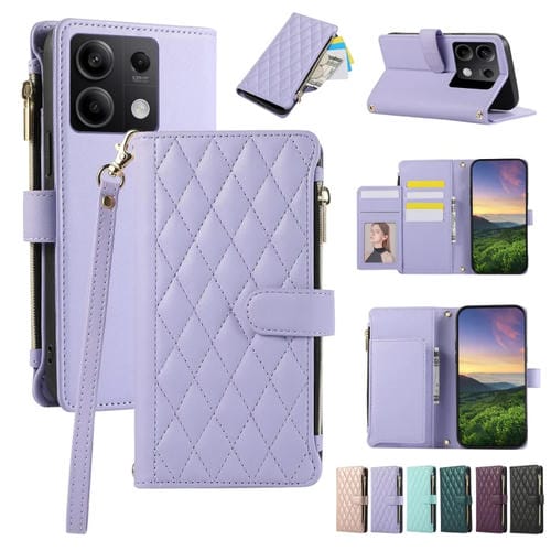 Funda de Cuero Tipo Billetera con Cremallera Rombal para Redmi Note 13 5G (Morado)