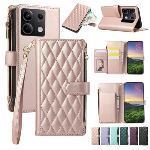 Funda de Cuero Tipo Billetera con Cremallera Rombal para Redmi Note 13 5G (Oro Rosa)