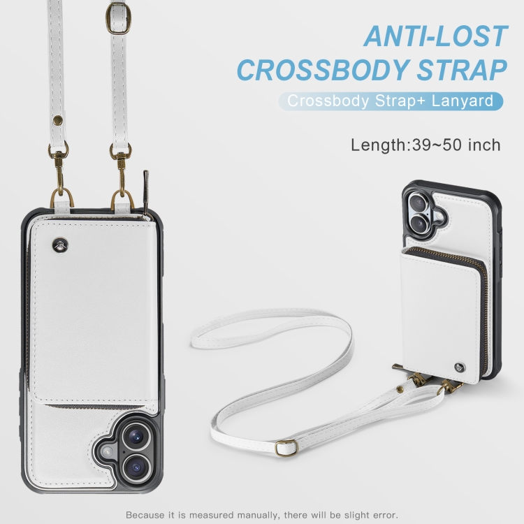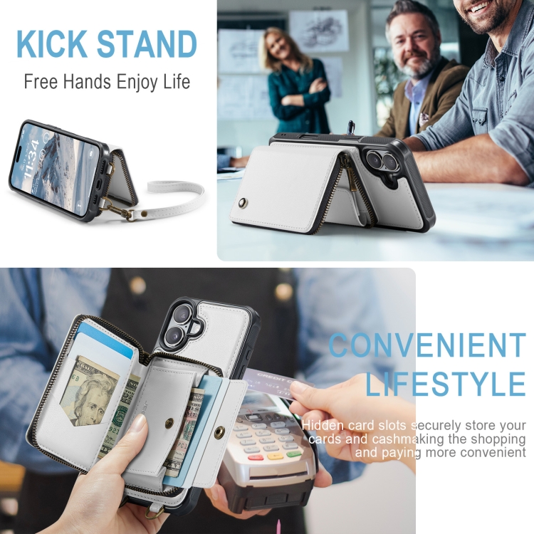 Funda de Cuero Tipo Billetera Jeehood C22 para iPhone 16 con Cremallera y Cordón Doble (Blanco)