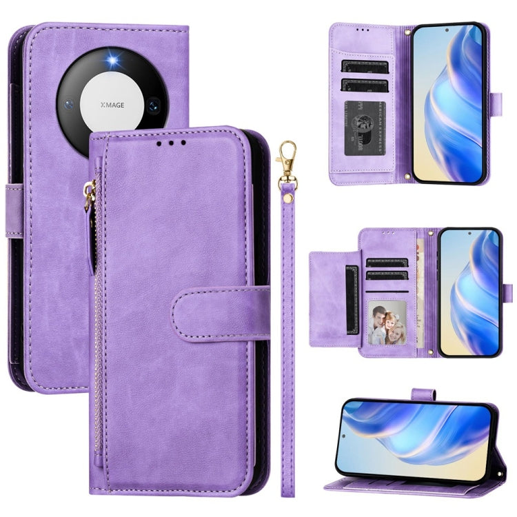 Funda Cuero Tipo Billetera Huawei Mate 60 con Cremallera y Ranuras para Tarjetas (Morado)