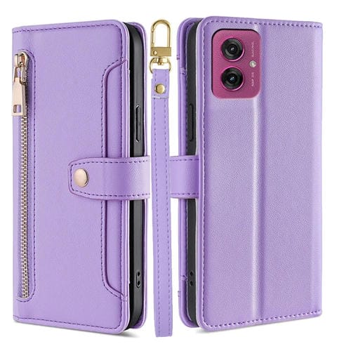 Funda de Cuero Tipo Billetera con Cremallera y Textura de Oveja para Motorola Moto G55 5G (Morado)