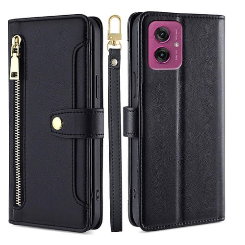 Funda de Cuero Tipo Billetera con Cremallera y Textura de Oveja para Motorola Moto G55 5G (Negra)