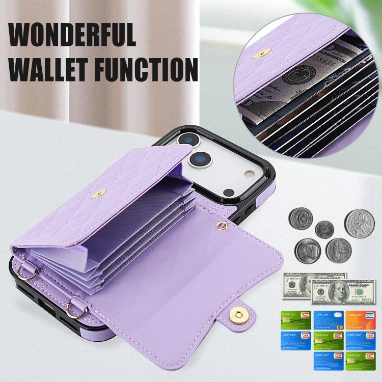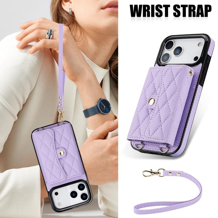 Funda de cuero tipo cartera horizontal con diseño rómbico cruzado para iPhone 17 Pro (morada)