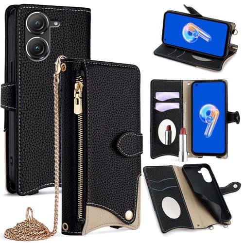 Funda de Cuero Tipo Lichi con Cola de Pez y Cadena Cruzada para Asus Zenfone 9/Zenfone 10 (Negra)