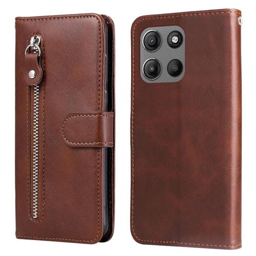 Funda de Piel con Cremallera y Textura de Becerro para Motorola Moto G15/G15 Power (Marrón)