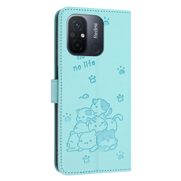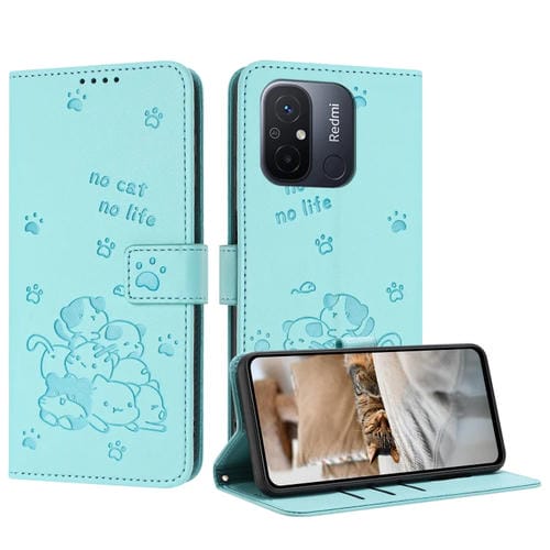 Funda de Piel con Diseño de Gatito En Relieve para Xiaomi Poco C55 con Cordón (Verde Menta)