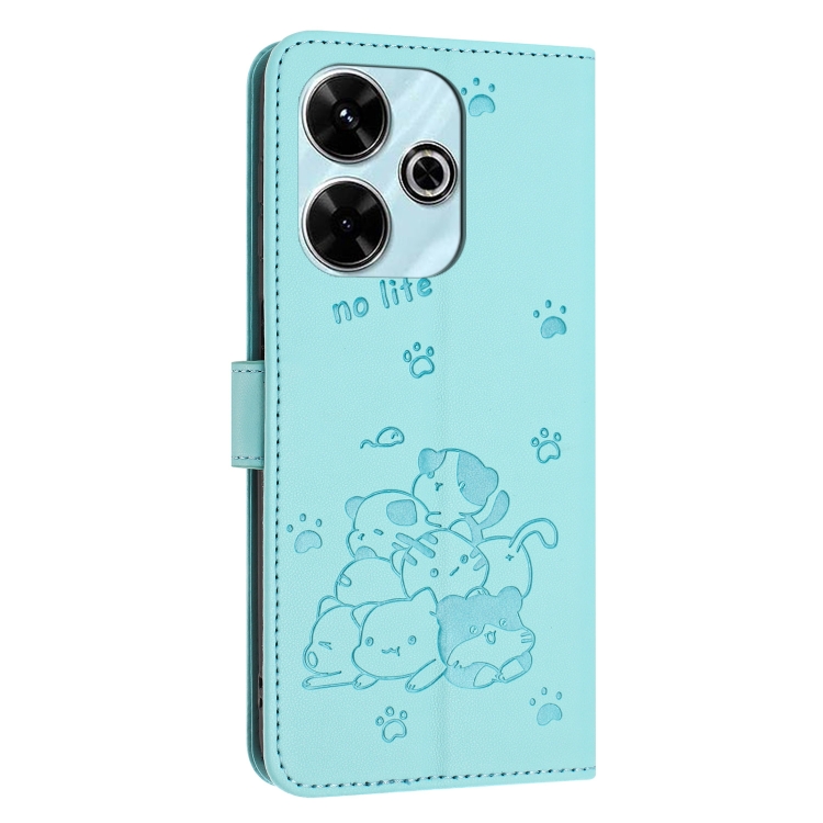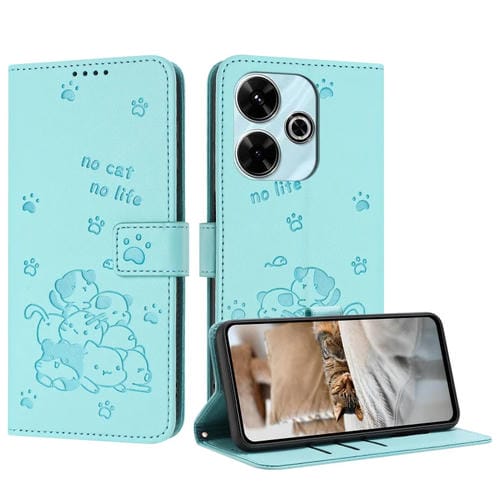 Funda de Piel con Diseño de Gatito En Relieve y Cordón para Xiaomi Poco M6 4G (Verde Menta)