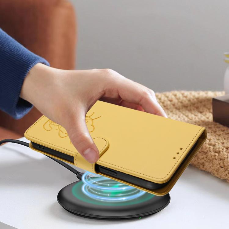 Funda de piel con diseño de gato y corazón en relieve para iPhone 17 con correa de mano (amarilla)